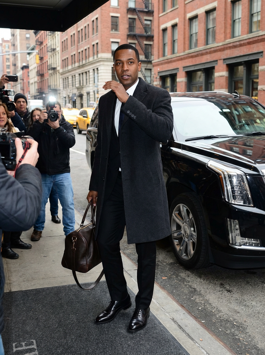 A celebrity leaving a five-star hotel in New York City, getting into a luxury black SUV while paparazzi take photos. The model is wearing a sharp overcoat with polished dress shoes and a leather duffle bag. The urban cityscape, featuring classic New York architecture, is visible in the background.