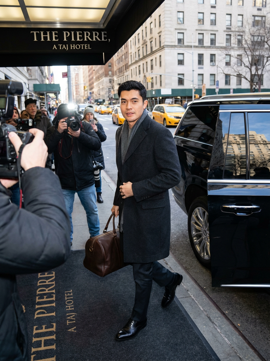 A celebrity leaving a five-star hotel in New York City, getting into a luxury black SUV while paparazzi take photos. The model is wearing a sharp overcoat with polished dress shoes and a leather duffle bag. The urban cityscape, featuring classic New York architecture, is visible in the background.