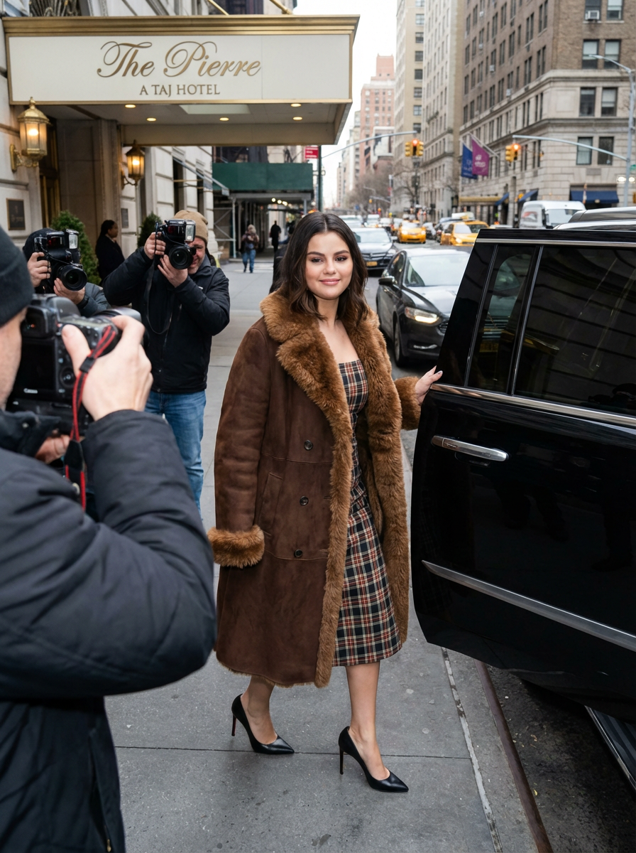 A celebrity leaving a five-star hotel in New York City, getting into a luxury black SUV while paparazzi take photos. The model is wearing an elegant high-end coat over a stylish dress with statement heels . The urban cityscape, featuring classic New York architecture, is visible in the background.