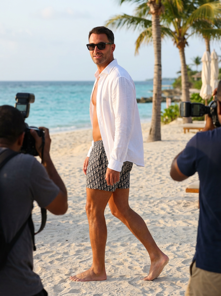 A celebrity spotted by paparazzi at a luxury beach resort, walking along the shoreline in designer swim trunks with a loose button-up shirt. The sun glows on their skin as they glance over at the cameras, maintaining a cool and confident expression. The backdrop features a turquoise ocean, soft white sand, and palm trees swaying in the breeze, creating a perfect vacation scene.