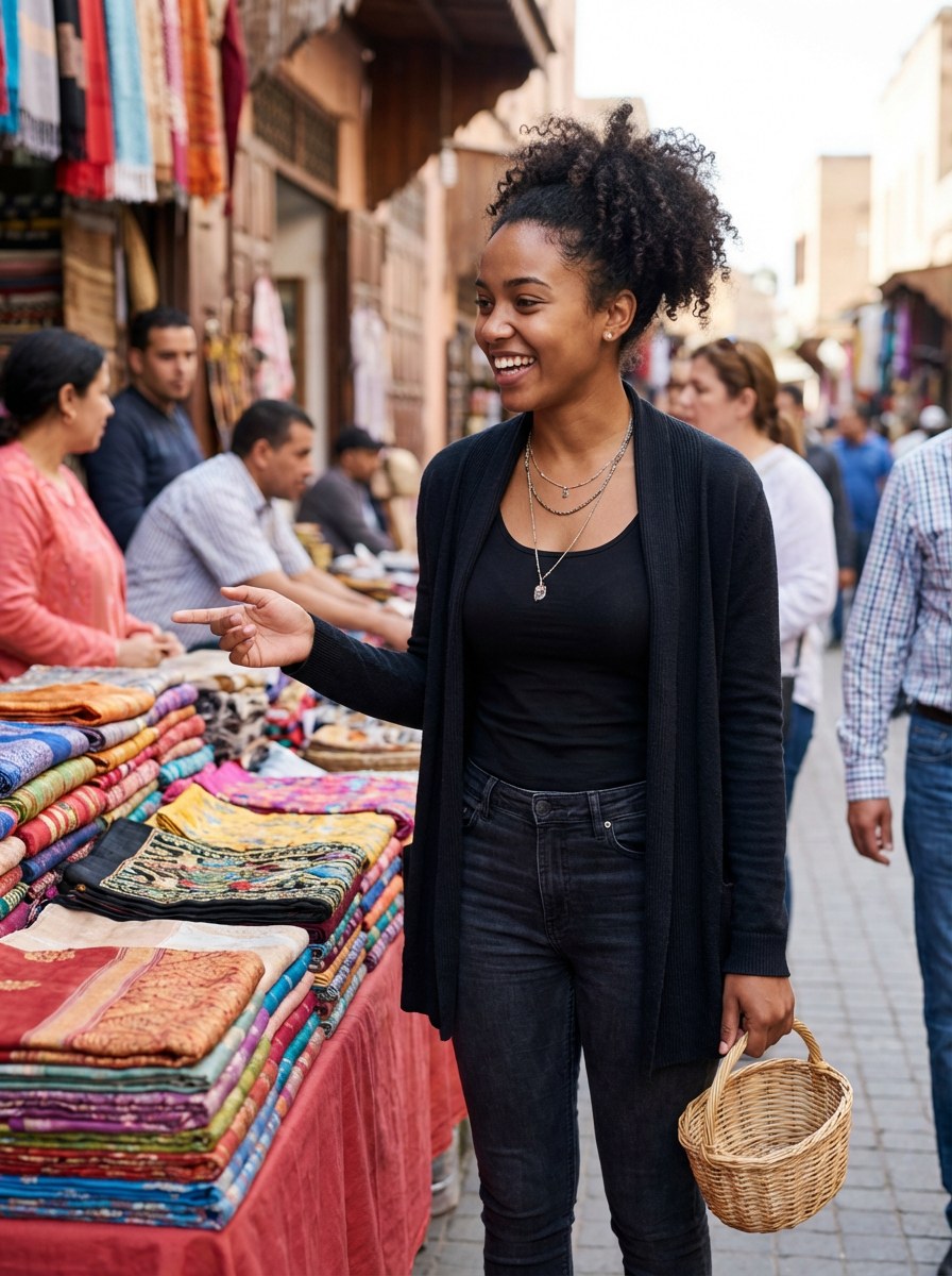a charismatic feminine model exploring a street market