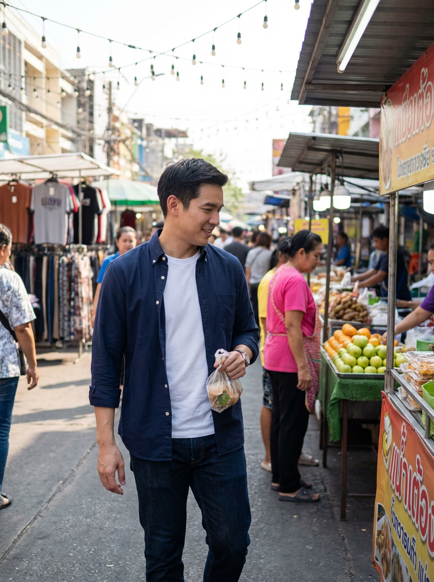 a charismatic masculine model exploring a street market