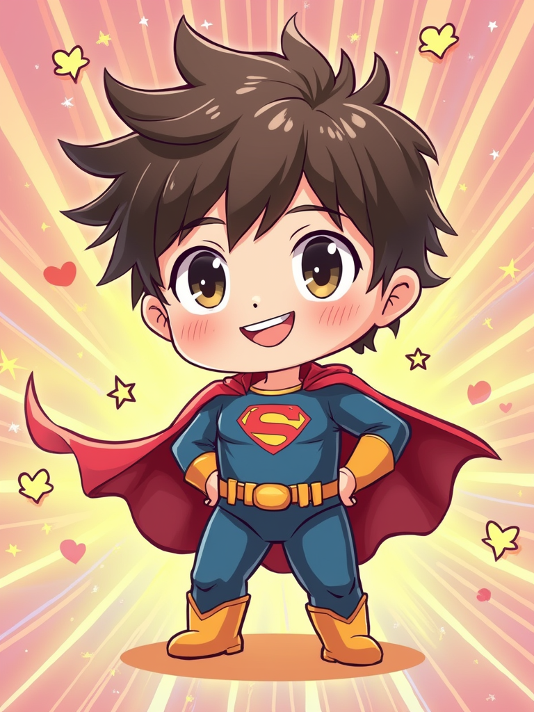 A chibi-style avatar of the model as a cheerful hero, wearing a tiny superhero costume with a cape and spiky hair. The background is a colorful burst of stars and hearts. The style is in cute chibi anime illustration.