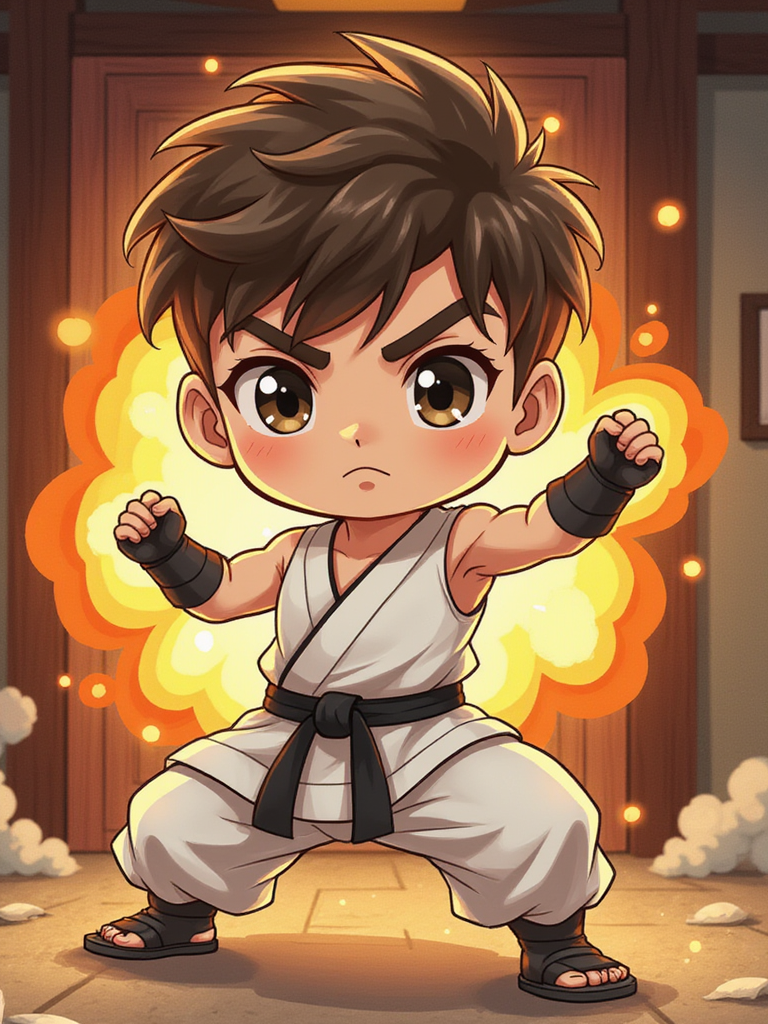 A chibi-style avatar of the model as a cheerful hero, wearing a tiny superhero costume with a cape and spiky hair. The background is a colorful burst of stars and hearts. The style is in cute chibi anime illustration.