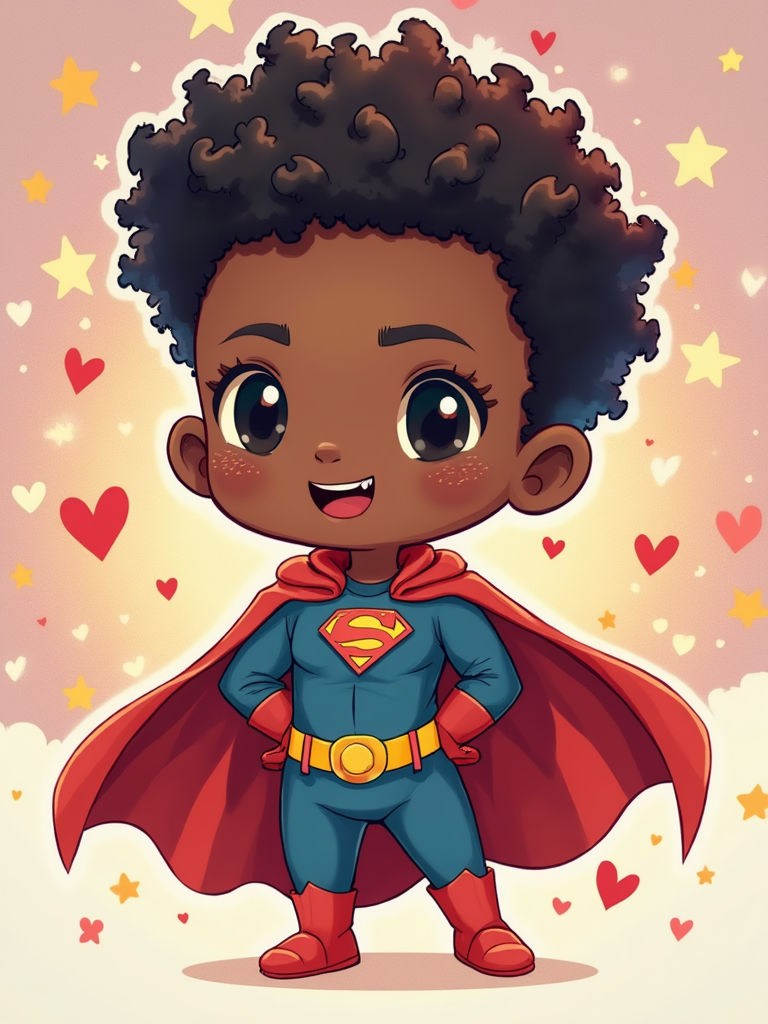 A chibi-style avatar of the model as a cheerful hero, wearing a tiny superhero costume with a cape and spiky hair. The background is a colorful burst of stars and hearts. The style is in cute chibi anime illustration.