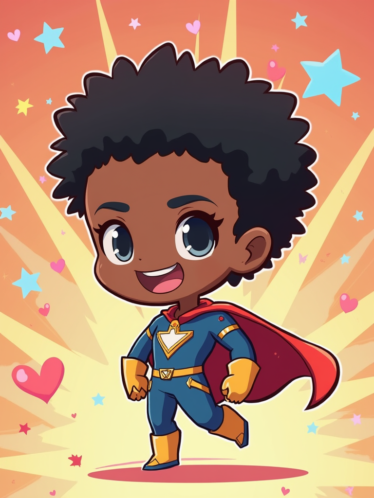 A chibi-style avatar of the model as a cheerful hero, wearing a tiny superhero costume with a cape and spiky hair. The background is a colorful burst of stars and hearts. The style is in cute chibi anime illustration.