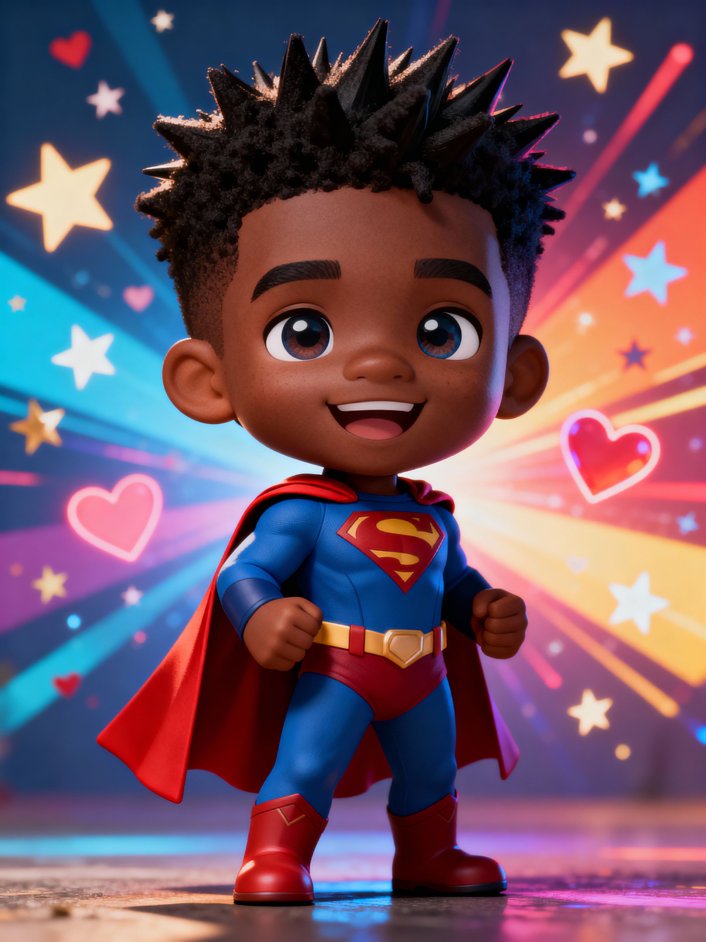 A chibi-style avatar of the model as a cheerful hero, wearing a tiny superhero costume with a cape and spiky hair. The background is a colorful burst of stars and hearts. The style is in cute chibi anime illustration.