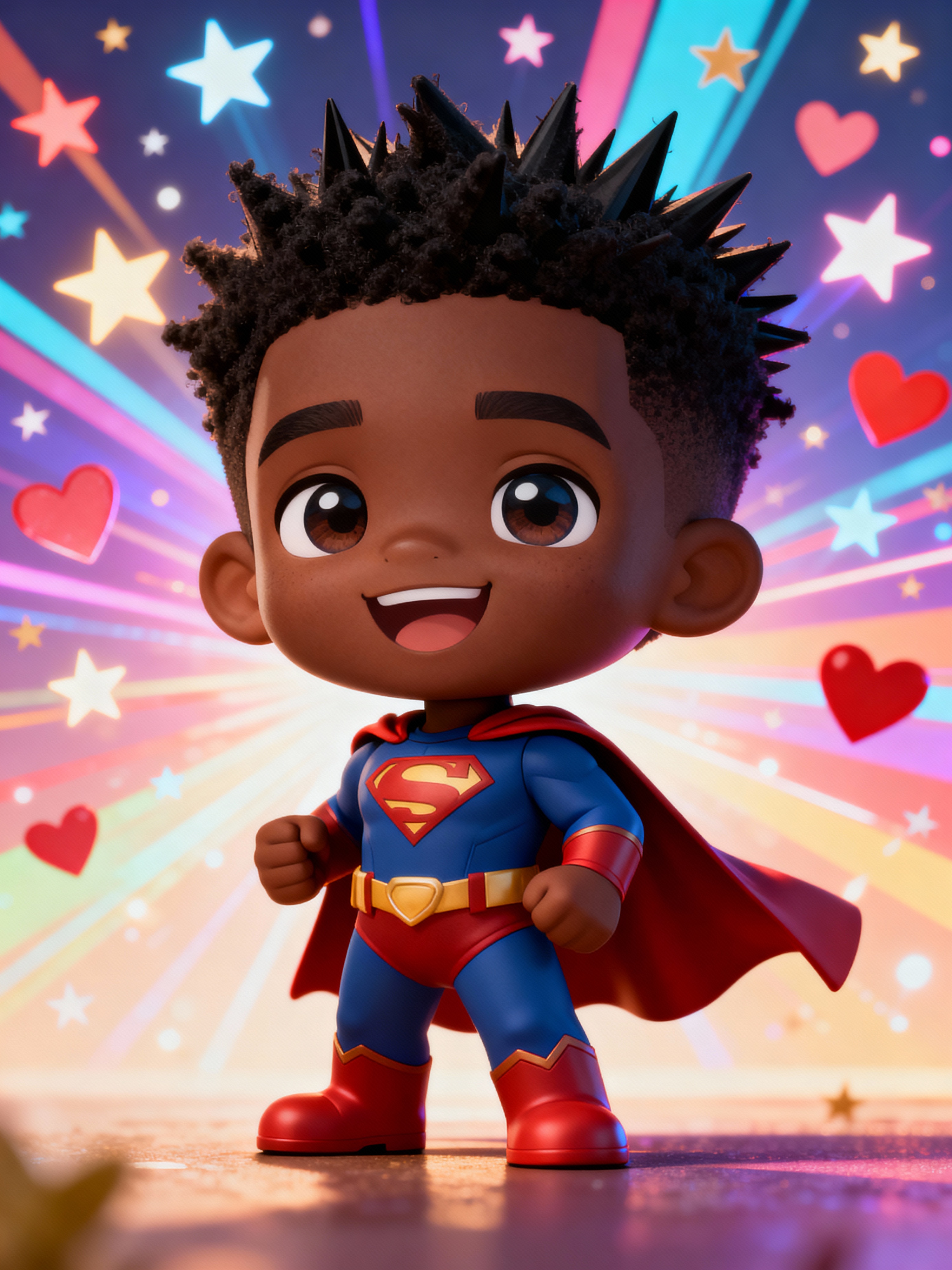 A chibi-style avatar of the model as a cheerful hero, wearing a tiny superhero costume with a cape and spiky hair. The background is a colorful burst of stars and hearts. The style is in cute chibi anime illustration.
