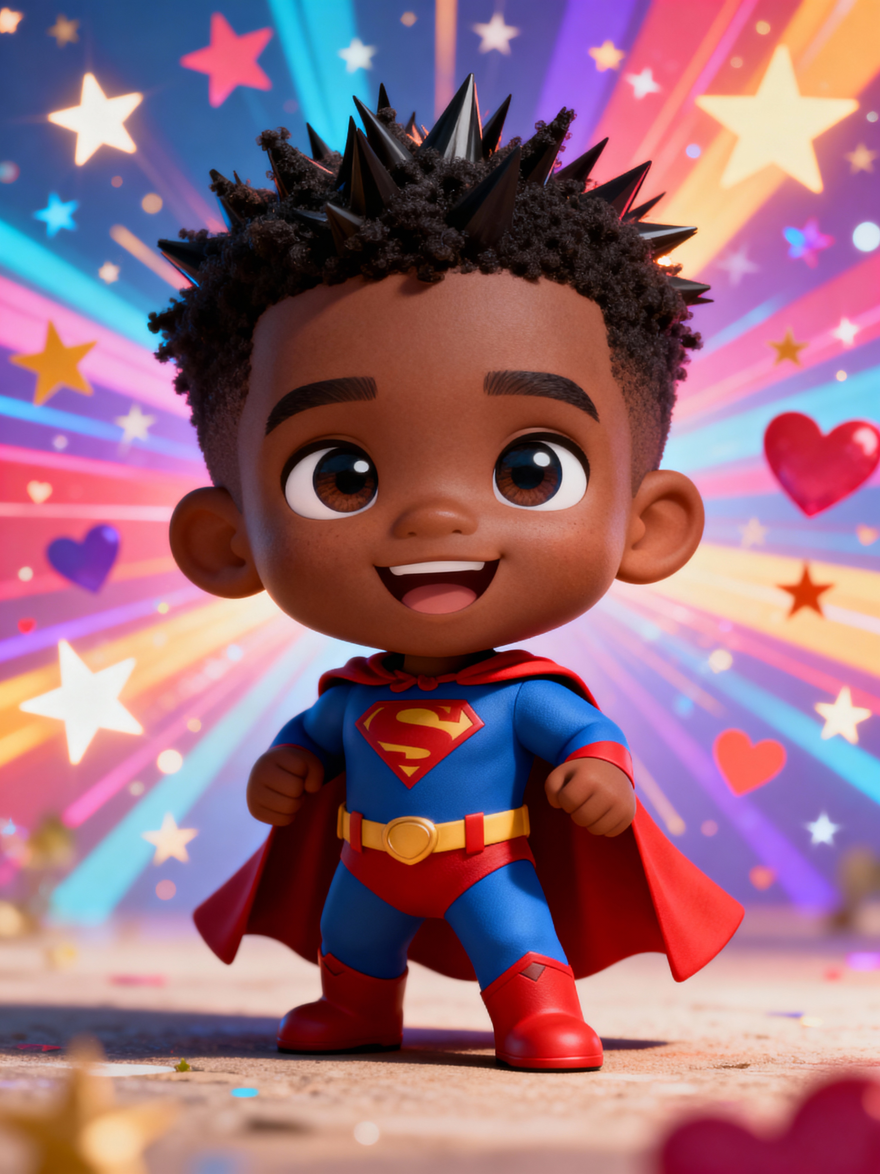 A chibi-style avatar of the model as a cheerful hero, wearing a tiny superhero costume with a cape and spiky hair. The background is a colorful burst of stars and hearts. The style is in cute chibi anime illustration.