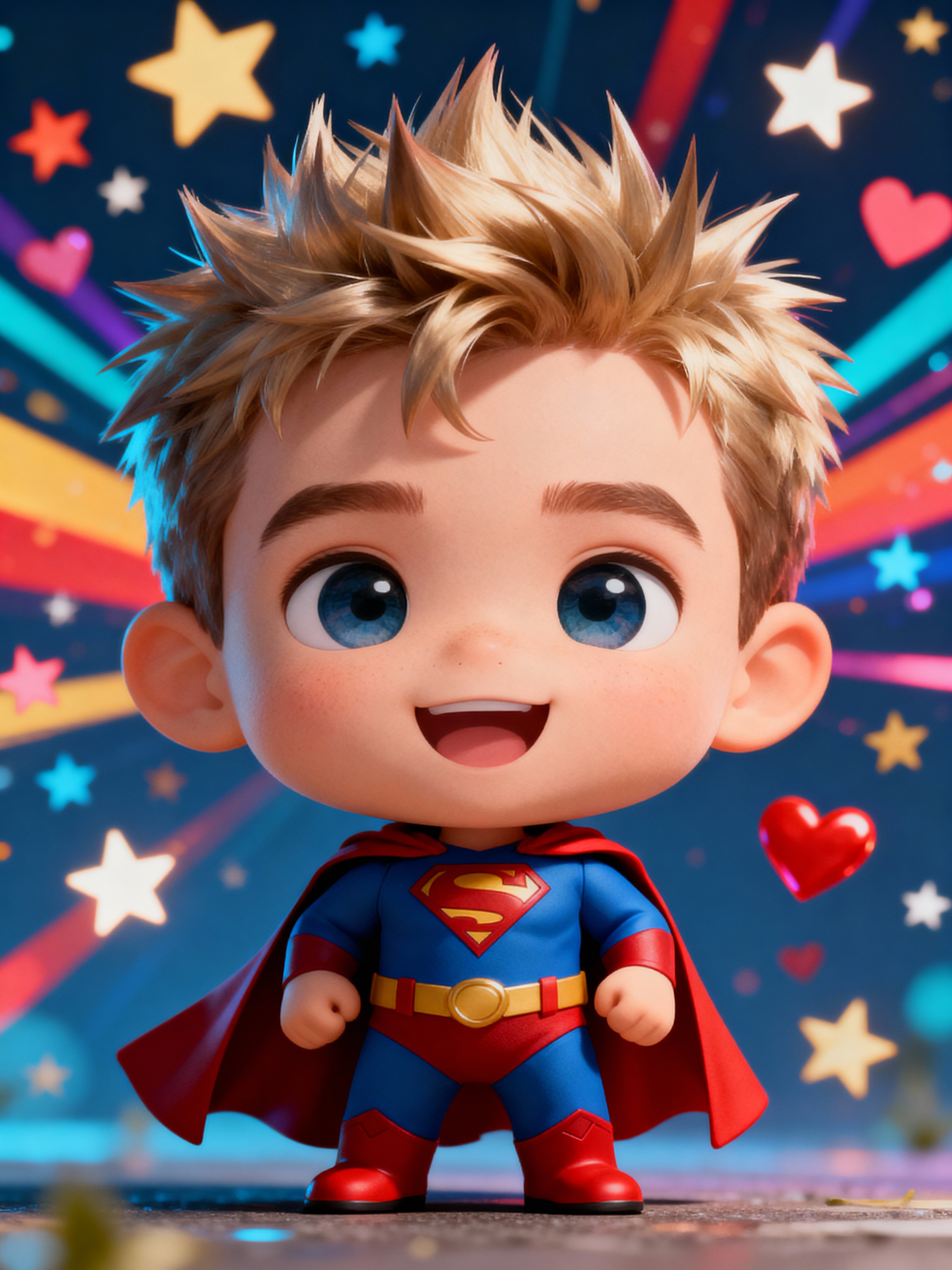 A chibi-style avatar of the model as a cheerful hero, wearing a tiny superhero costume with a cape and spiky hair. The background is a colorful burst of stars and hearts. The style is in cute chibi anime illustration.