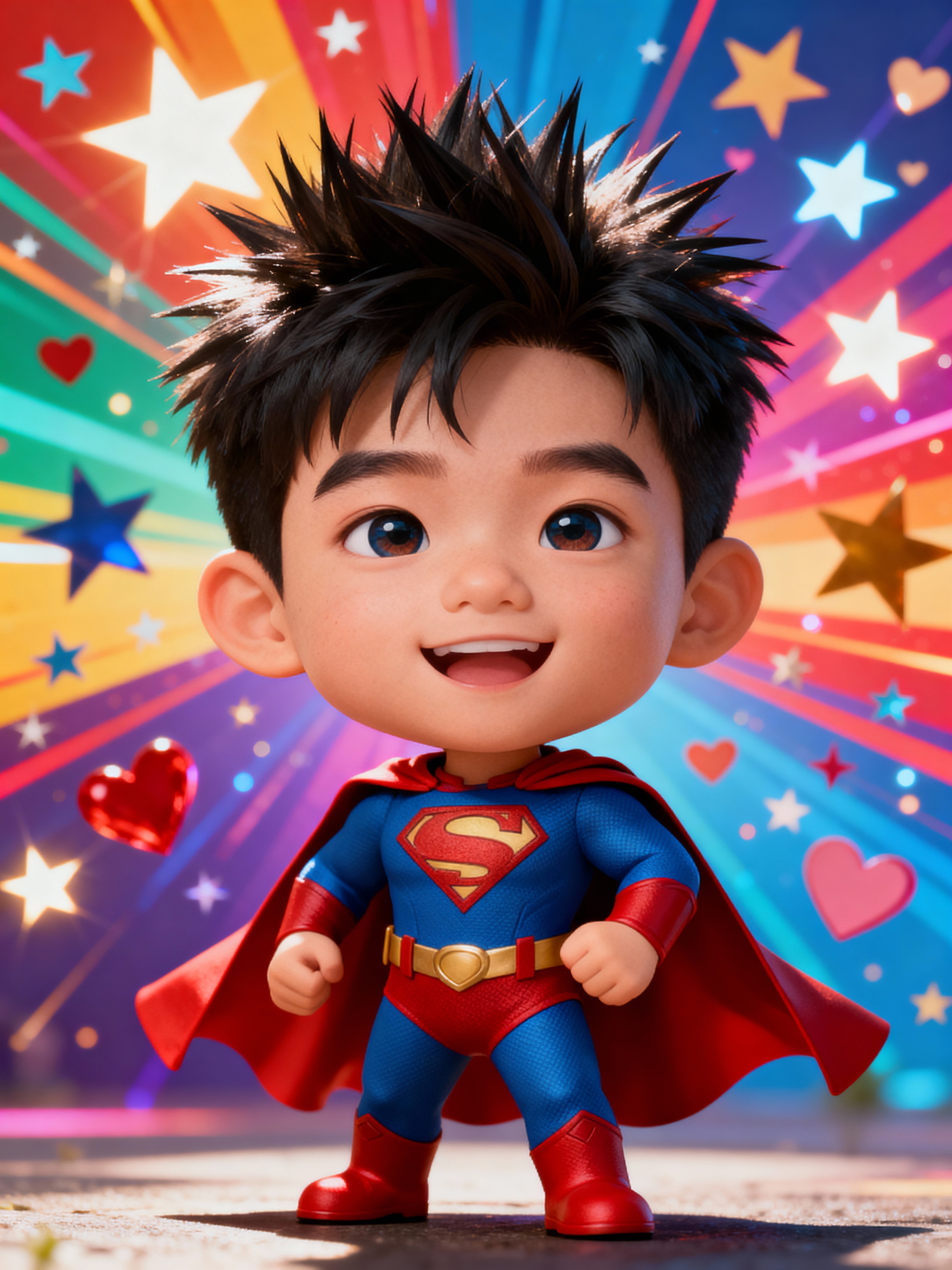 A chibi-style avatar of the model as a cheerful hero, wearing a tiny superhero costume with a cape and spiky hair. The background is a colorful burst of stars and hearts. The style is in cute chibi anime illustration.