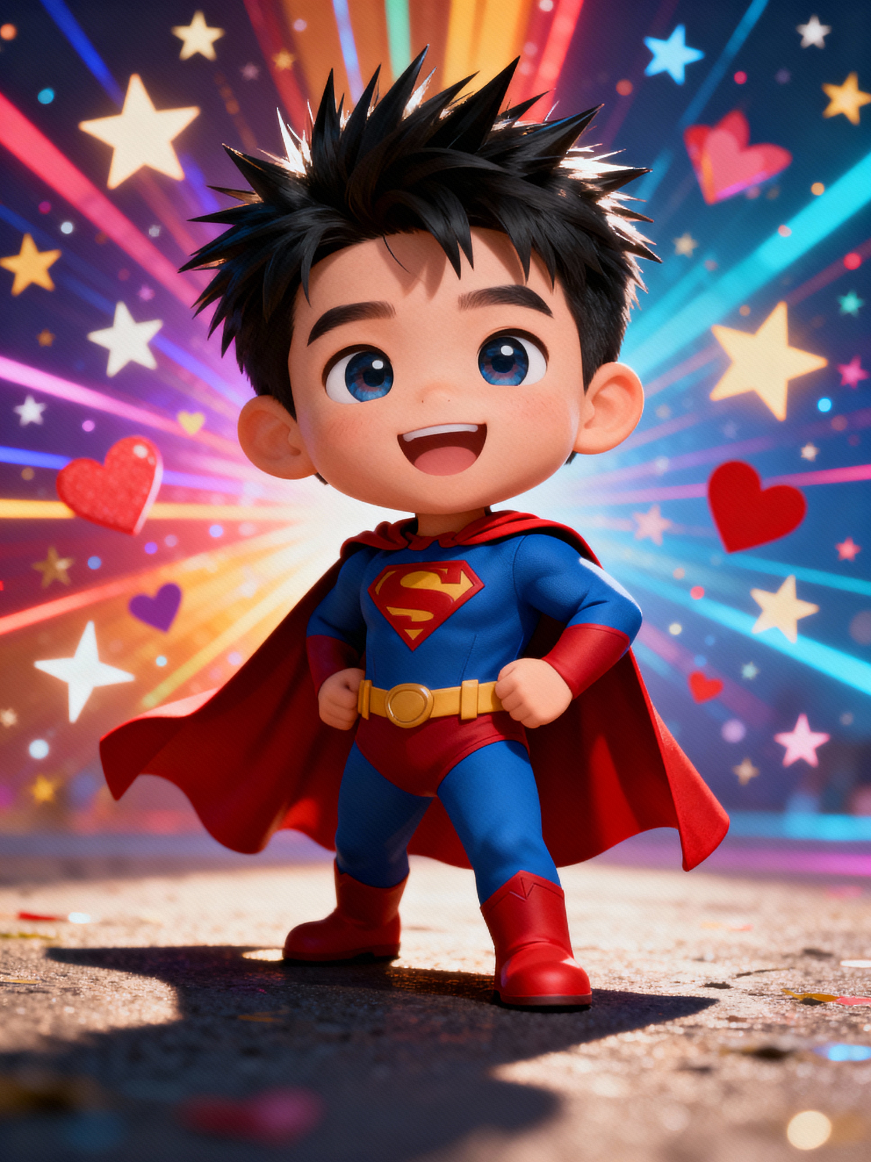 A chibi-style avatar of the model as a cheerful hero, wearing a tiny superhero costume with a cape and spiky hair. The background is a colorful burst of stars and hearts. The style is in cute chibi anime illustration.