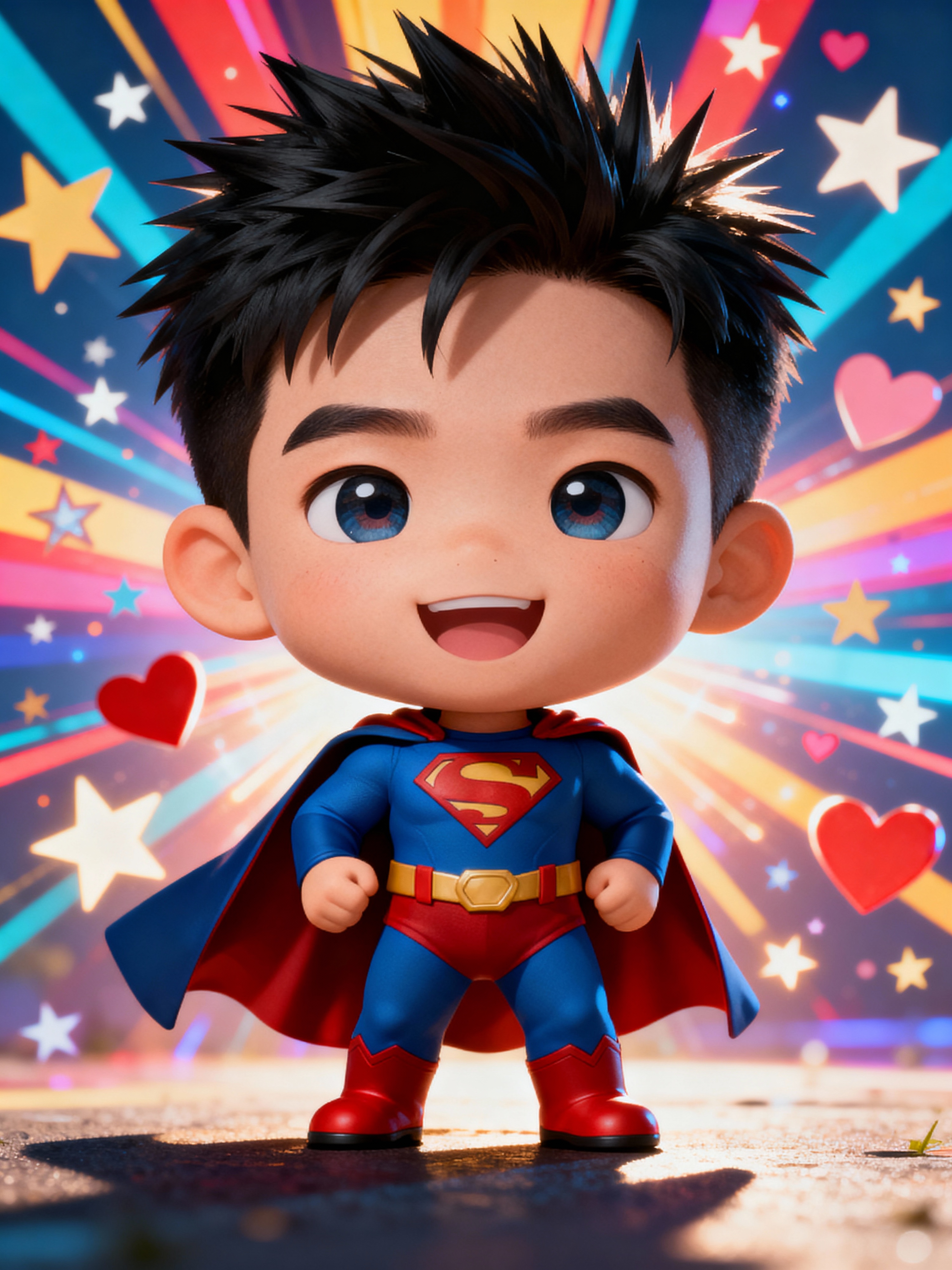 A chibi-style avatar of the model as a cheerful hero, wearing a tiny superhero costume with a cape and spiky hair. The background is a colorful burst of stars and hearts. The style is in cute chibi anime illustration.