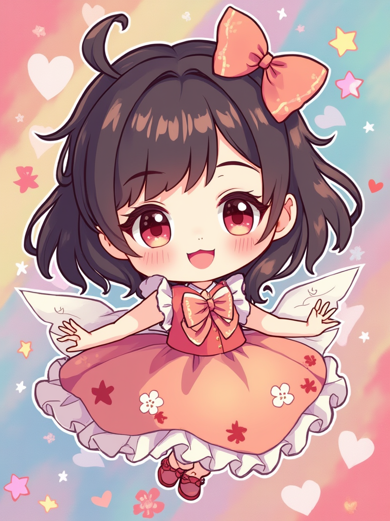 A chibi-style avatar of the model as a cheerful hero, wearing a frilly magical girl dress with oversized bows and sparkling eyes . The background is a colorful burst of stars and hearts. The style is in cute chibi anime illustration.
