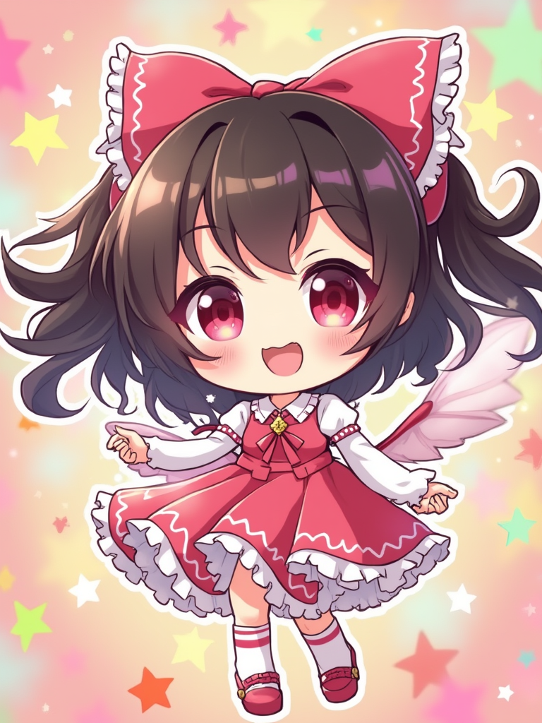 A chibi-style avatar of the model as a cheerful hero, wearing a frilly magical girl dress with oversized bows and sparkling eyes . The background is a colorful burst of stars and hearts. The style is in cute chibi anime illustration.