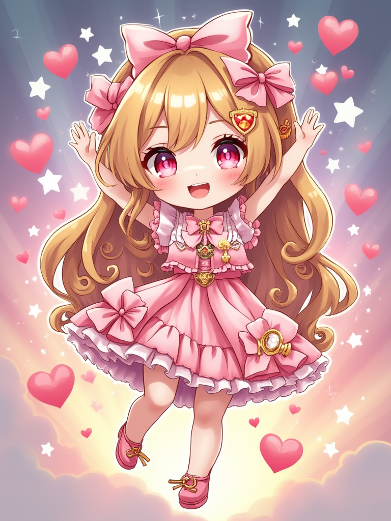 A chibi-style avatar of the model as a cheerful hero, wearing a frilly magical girl dress with oversized bows and sparkling eyes . The background is a colorful burst of stars and hearts. The style is in cute chibi anime illustration.