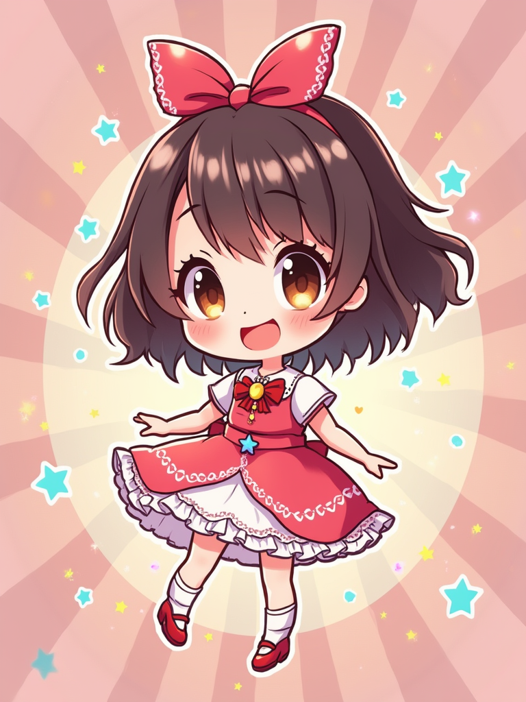 A chibi-style avatar of the model as a cheerful hero, wearing a frilly magical girl dress with oversized bows and sparkling eyes . The background is a colorful burst of stars and hearts. The style is in cute chibi anime illustration.