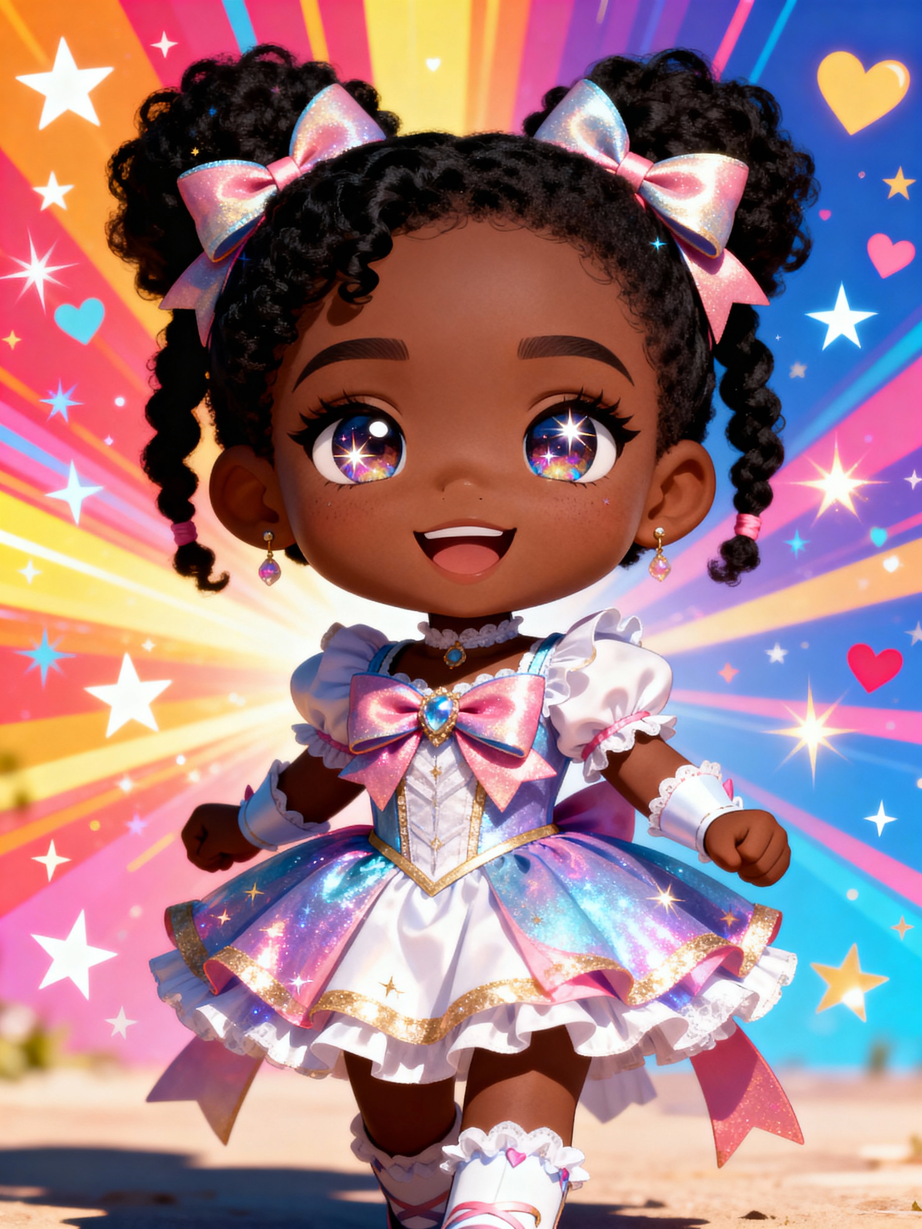 A chibi-style avatar of the model as a cheerful hero, wearing a frilly magical girl dress with oversized bows and sparkling eyes . The background is a colorful burst of stars and hearts. The style is in cute chibi anime illustration.