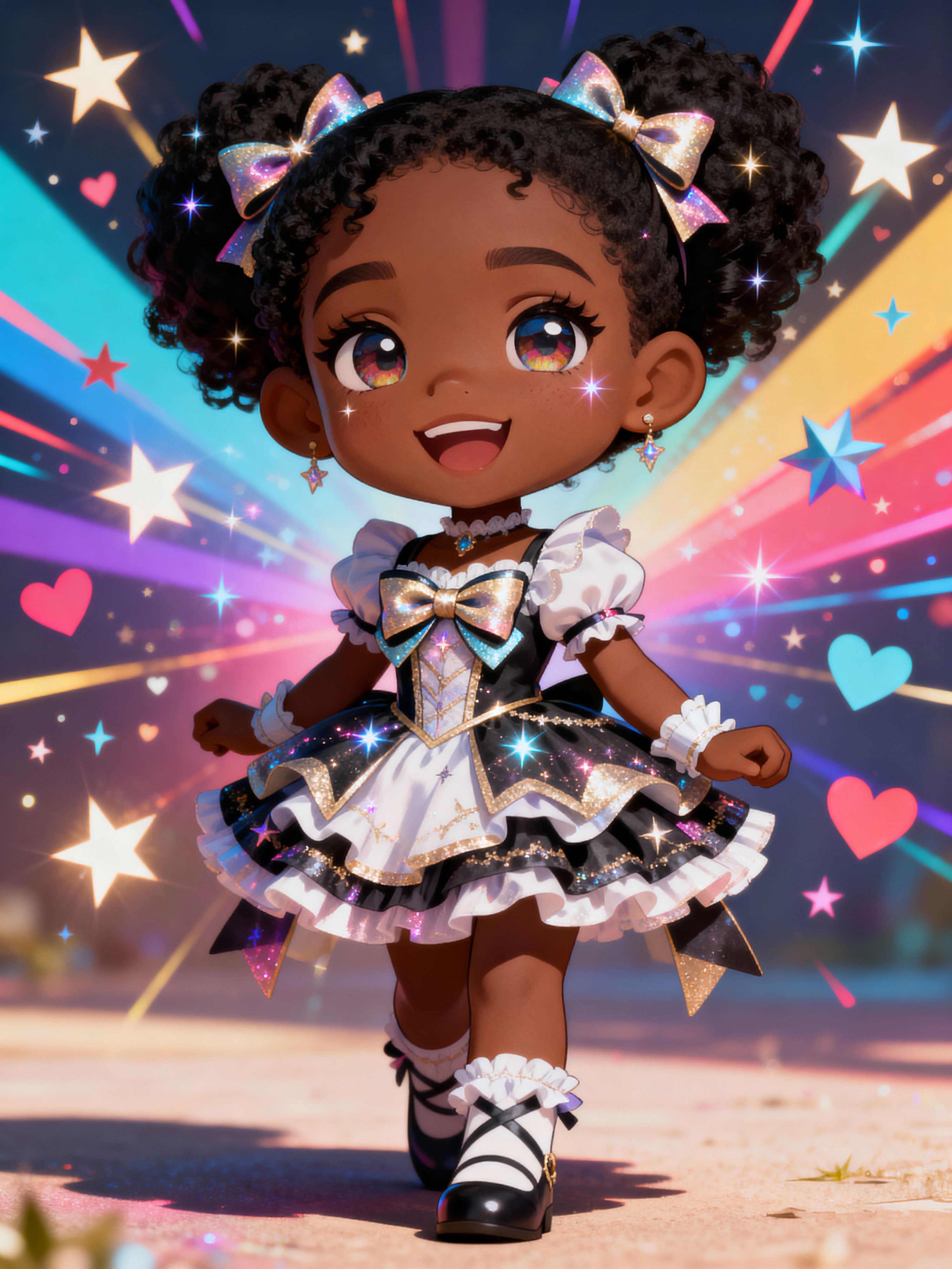 A chibi-style avatar of the model as a cheerful hero, wearing a frilly magical girl dress with oversized bows and sparkling eyes . The background is a colorful burst of stars and hearts. The style is in cute chibi anime illustration.