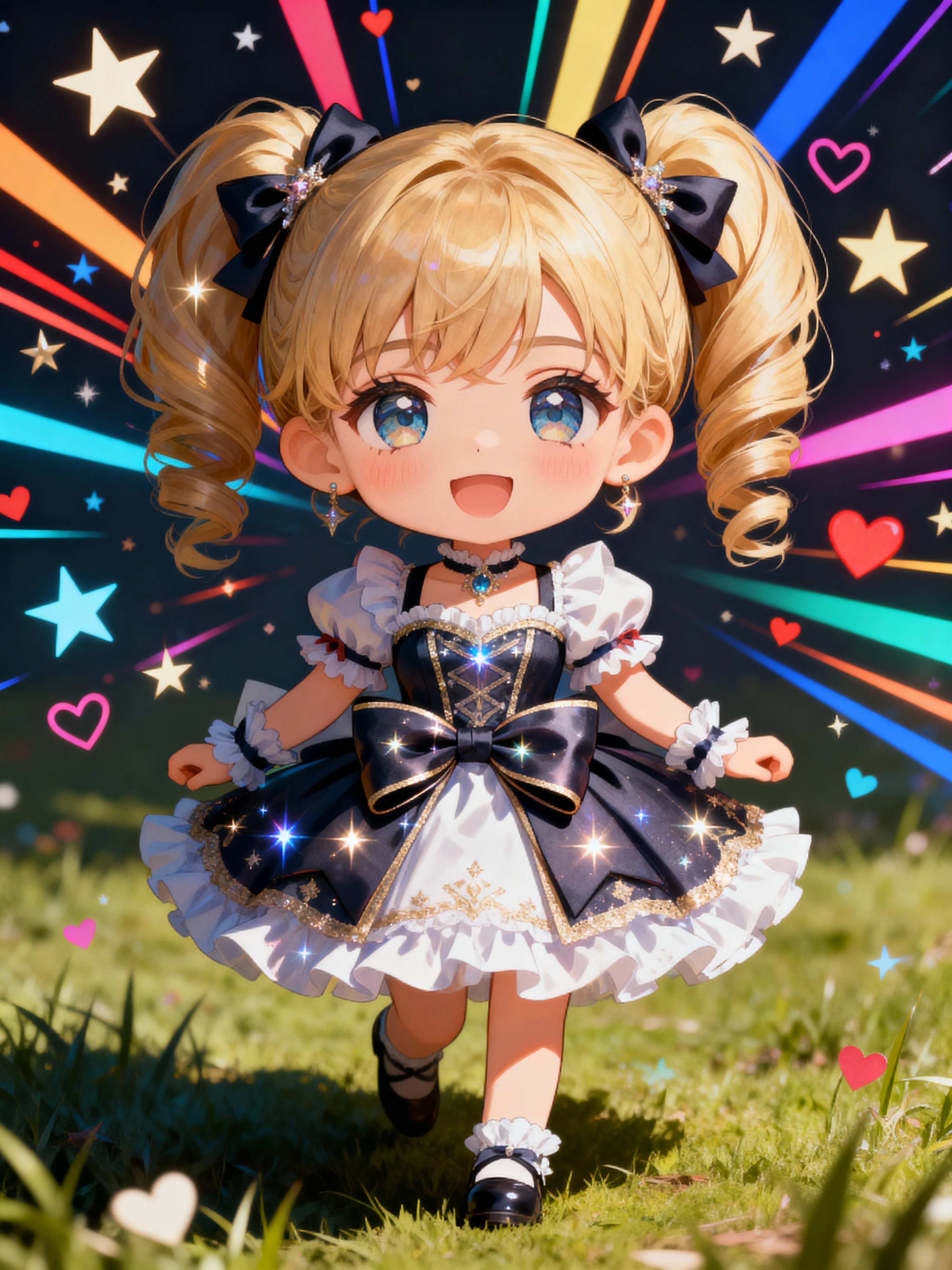 A chibi-style avatar of the model as a cheerful hero, wearing a frilly magical girl dress with oversized bows and sparkling eyes . The background is a colorful burst of stars and hearts. The style is in cute chibi anime illustration.