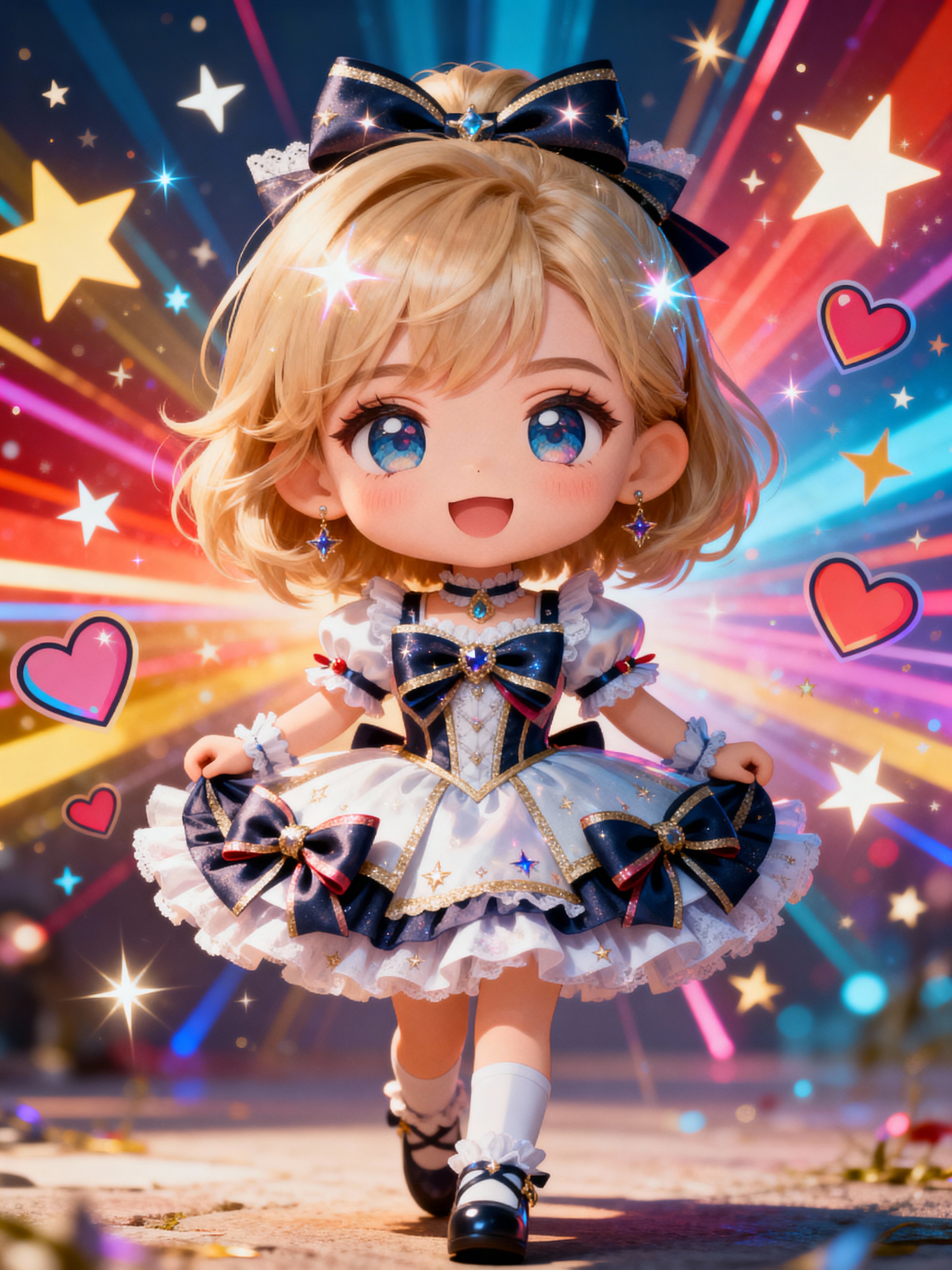 A chibi-style avatar of the model as a cheerful hero, wearing a frilly magical girl dress with oversized bows and sparkling eyes . The background is a colorful burst of stars and hearts. The style is in cute chibi anime illustration.