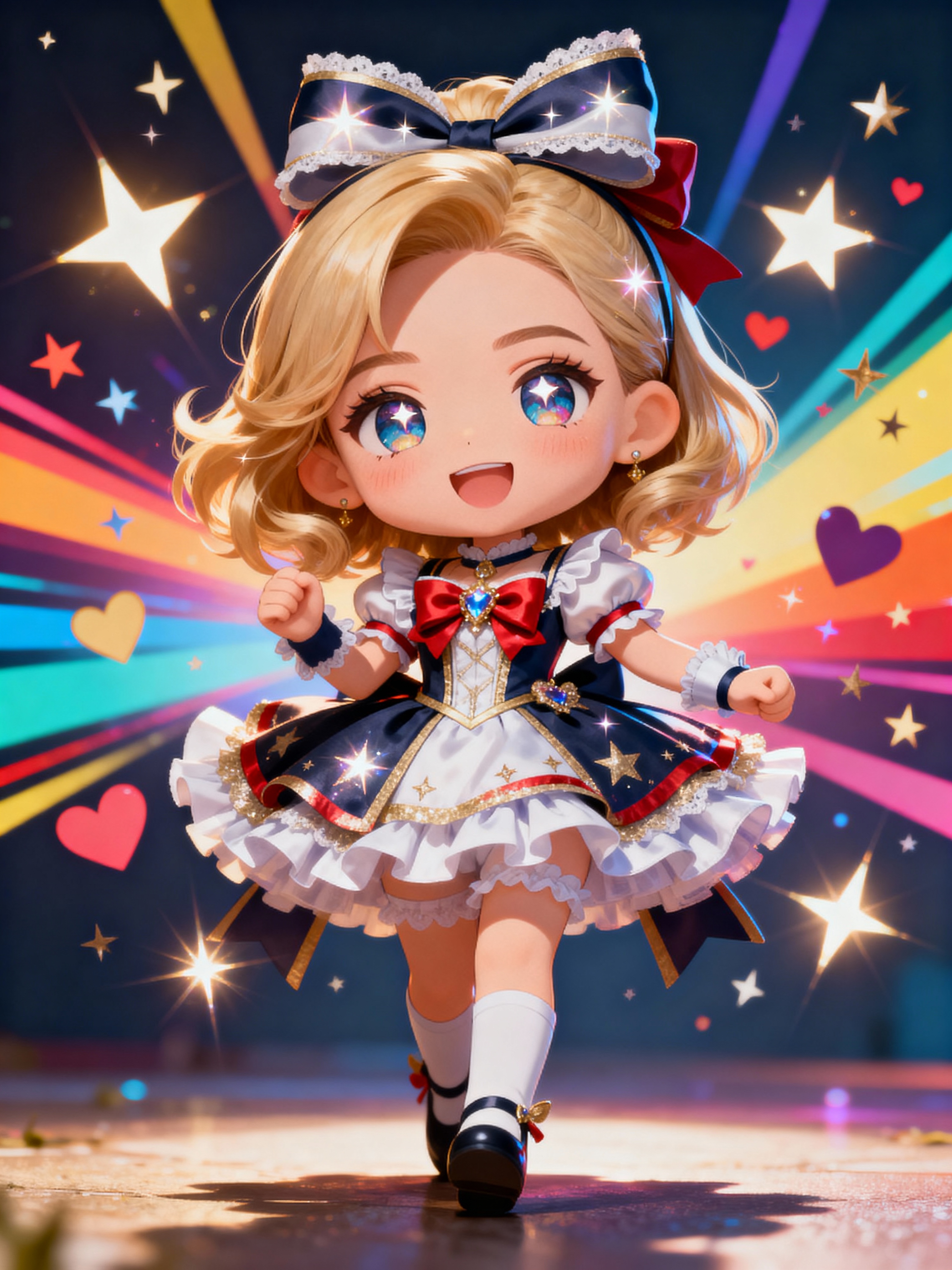 A chibi-style avatar of the model as a cheerful hero, wearing a frilly magical girl dress with oversized bows and sparkling eyes . The background is a colorful burst of stars and hearts. The style is in cute chibi anime illustration.