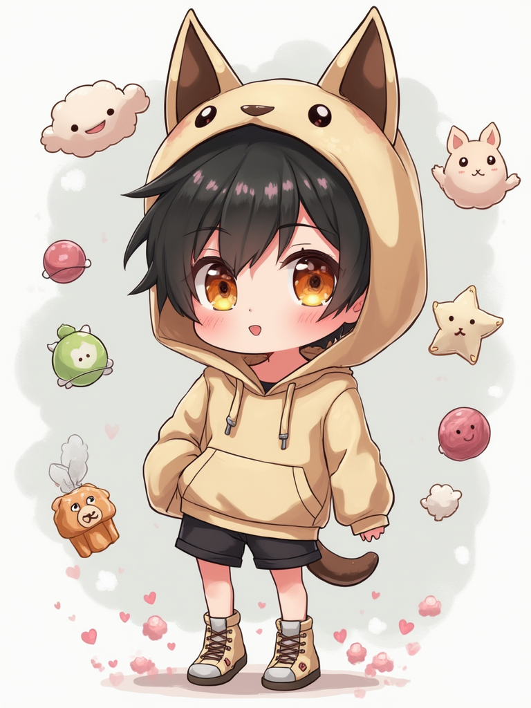 A chibi version of the model with huge sparkling eyes and a playful expression, wearing a baggy hoodie with animal ears and shorts. Surrounded by floating sweets and soft clouds. The style is in cute chibi anime illustration.