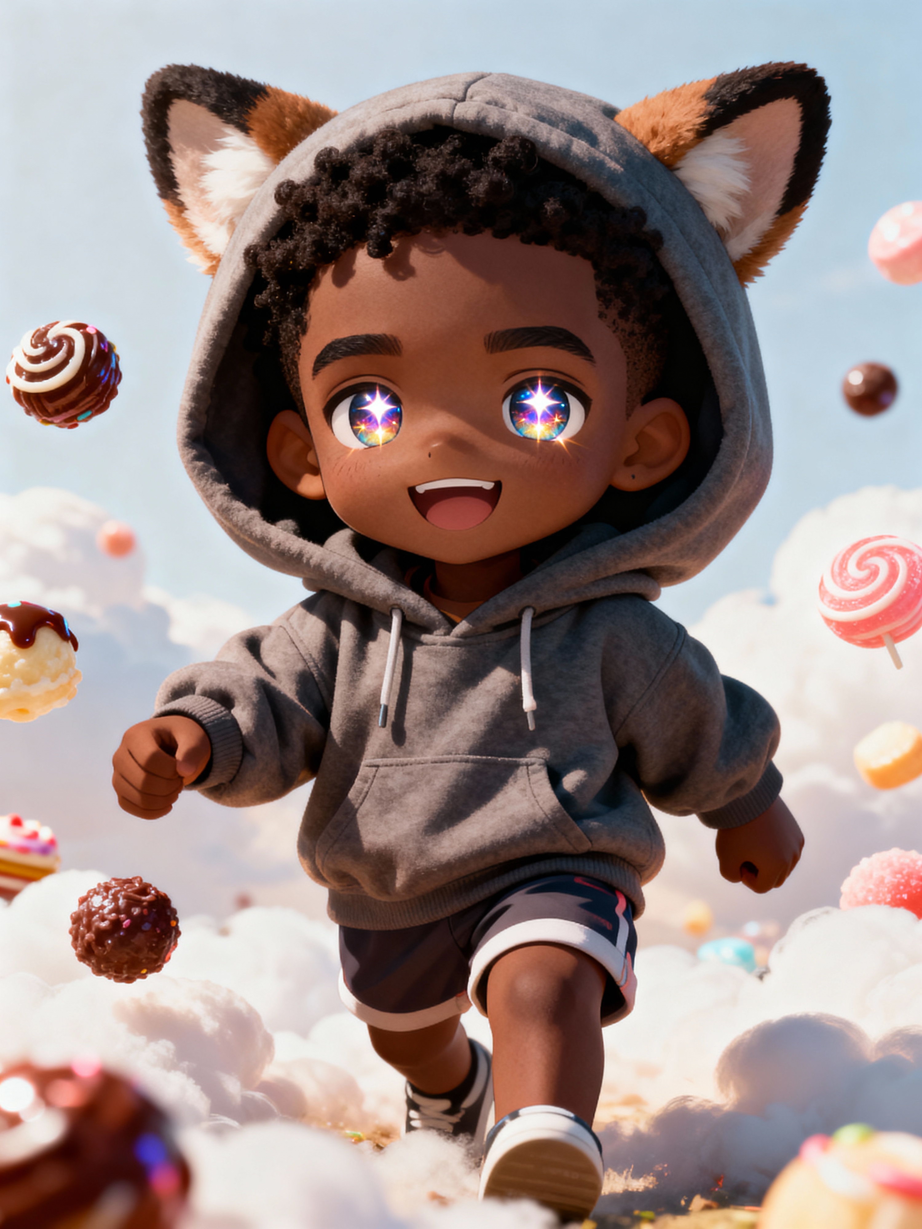 A chibi version of the model with huge sparkling eyes and a playful expression, wearing a baggy hoodie with animal ears and shorts. Surrounded by floating sweets and soft clouds. The style is in cute chibi anime illustration.