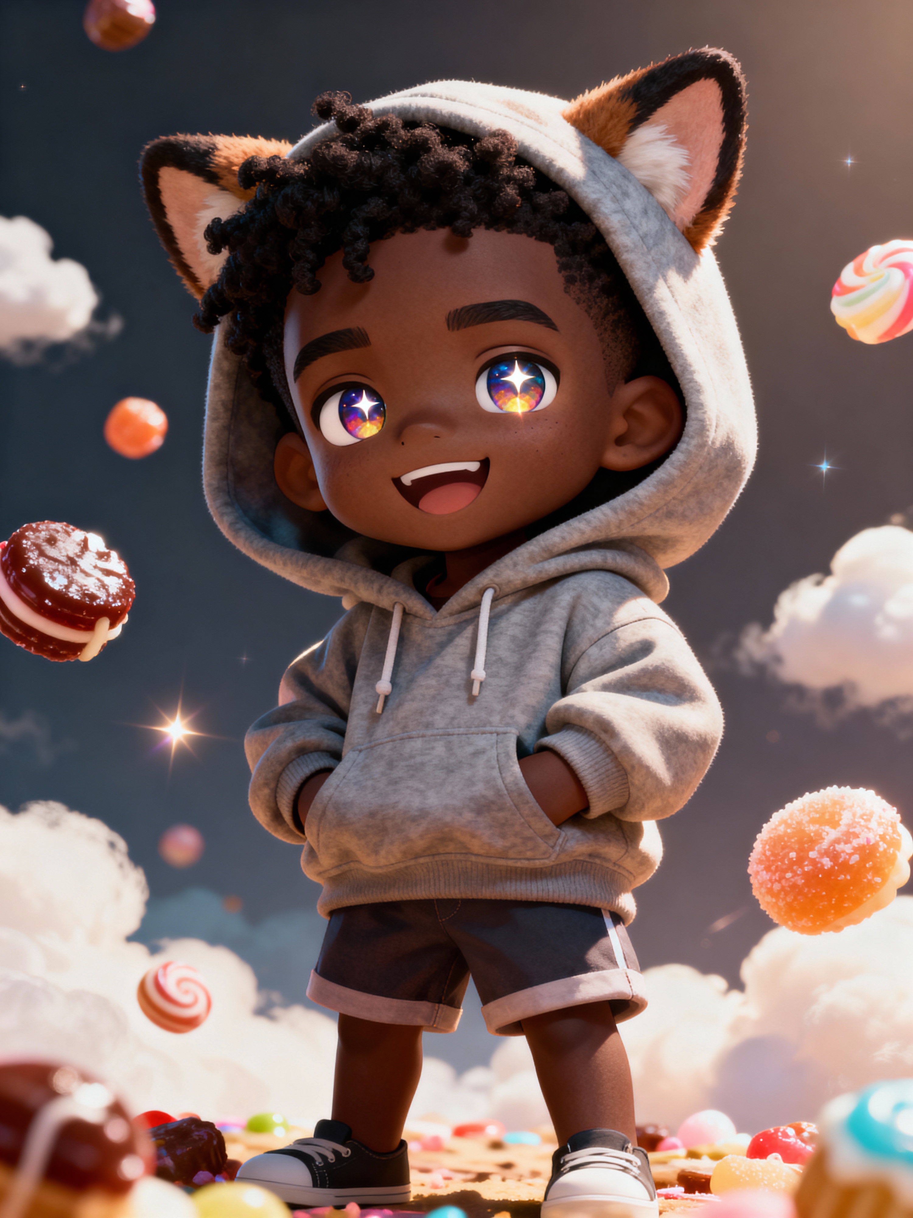 A chibi version of the model with huge sparkling eyes and a playful expression, wearing a baggy hoodie with animal ears and shorts. Surrounded by floating sweets and soft clouds. The style is in cute chibi anime illustration.