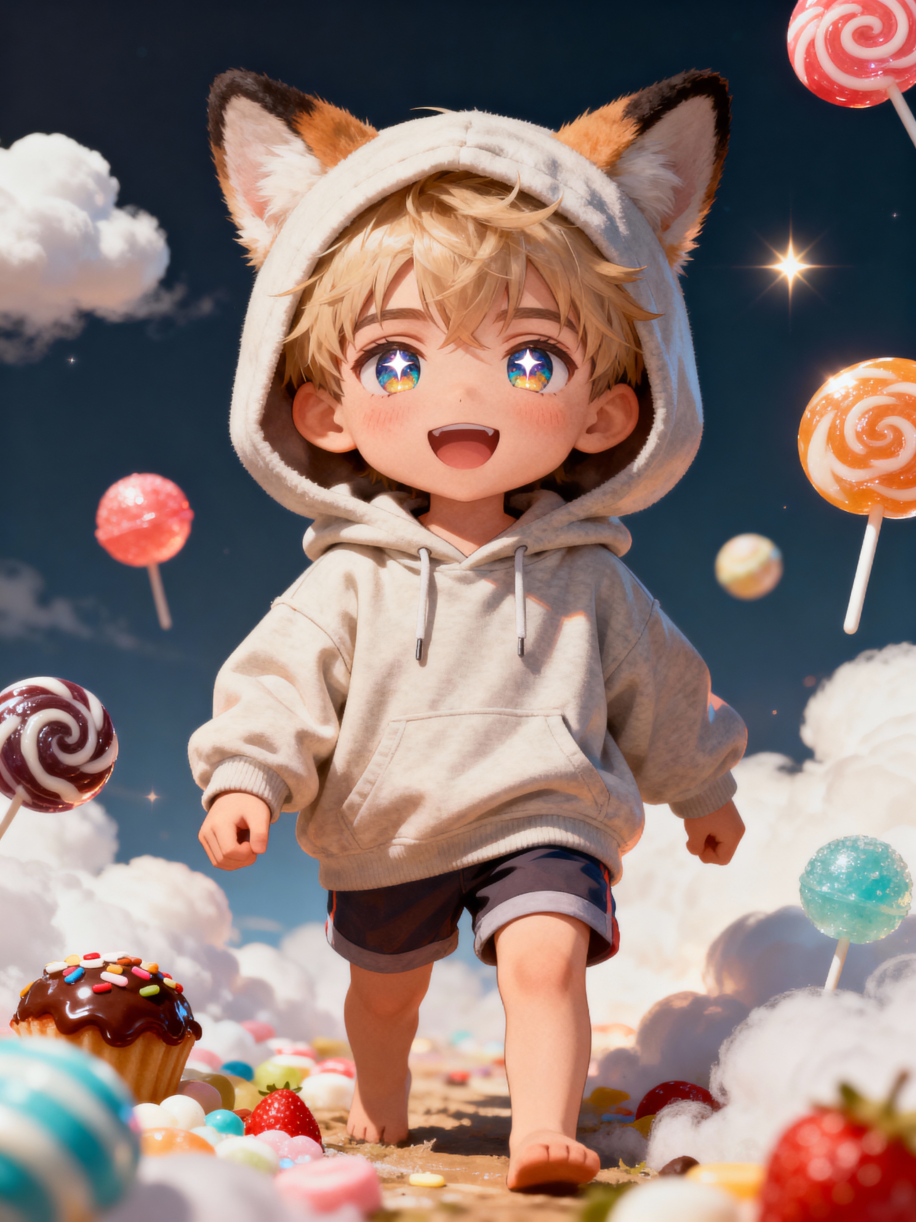A chibi version of the model with huge sparkling eyes and a playful expression, wearing a baggy hoodie with animal ears and shorts. Surrounded by floating sweets and soft clouds. The style is in cute chibi anime illustration.