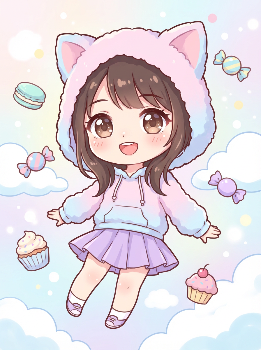 A chibi version of the model with huge sparkling eyes and a playful expression, wearing a pastel hoodie with animal ears and a pleated skirt . Surrounded by floating sweets and soft clouds. The style is in cute chibi anime illustration.