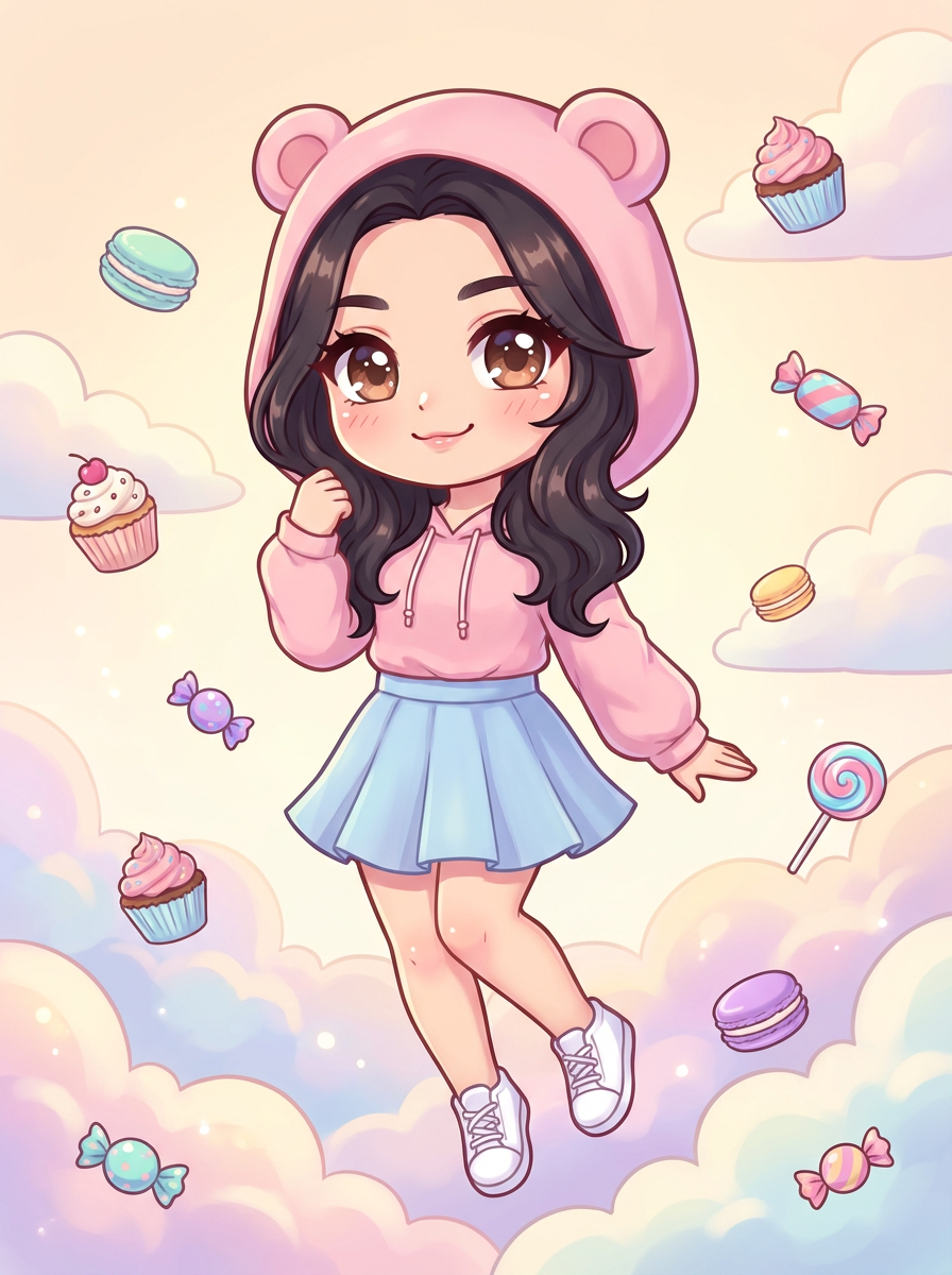 A chibi version of the model with huge sparkling eyes and a playful expression, wearing a pastel hoodie with animal ears and a pleated skirt . Surrounded by floating sweets and soft clouds. The style is in cute chibi anime illustration.