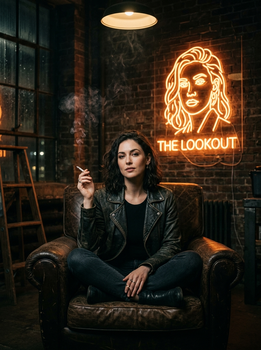 A cinematic neo-noir portrait of a model sitting cross-legged on a worn leather armchair in an industrial loft. She holds a cigarette with soft smoke drifting upward. Warm orange neon sign behind her showing a line-art portrait of her face. Brick wall background, moody lighting, film grain, shallow depth of field, dramatic shadows, 1:1 aspect ratio.