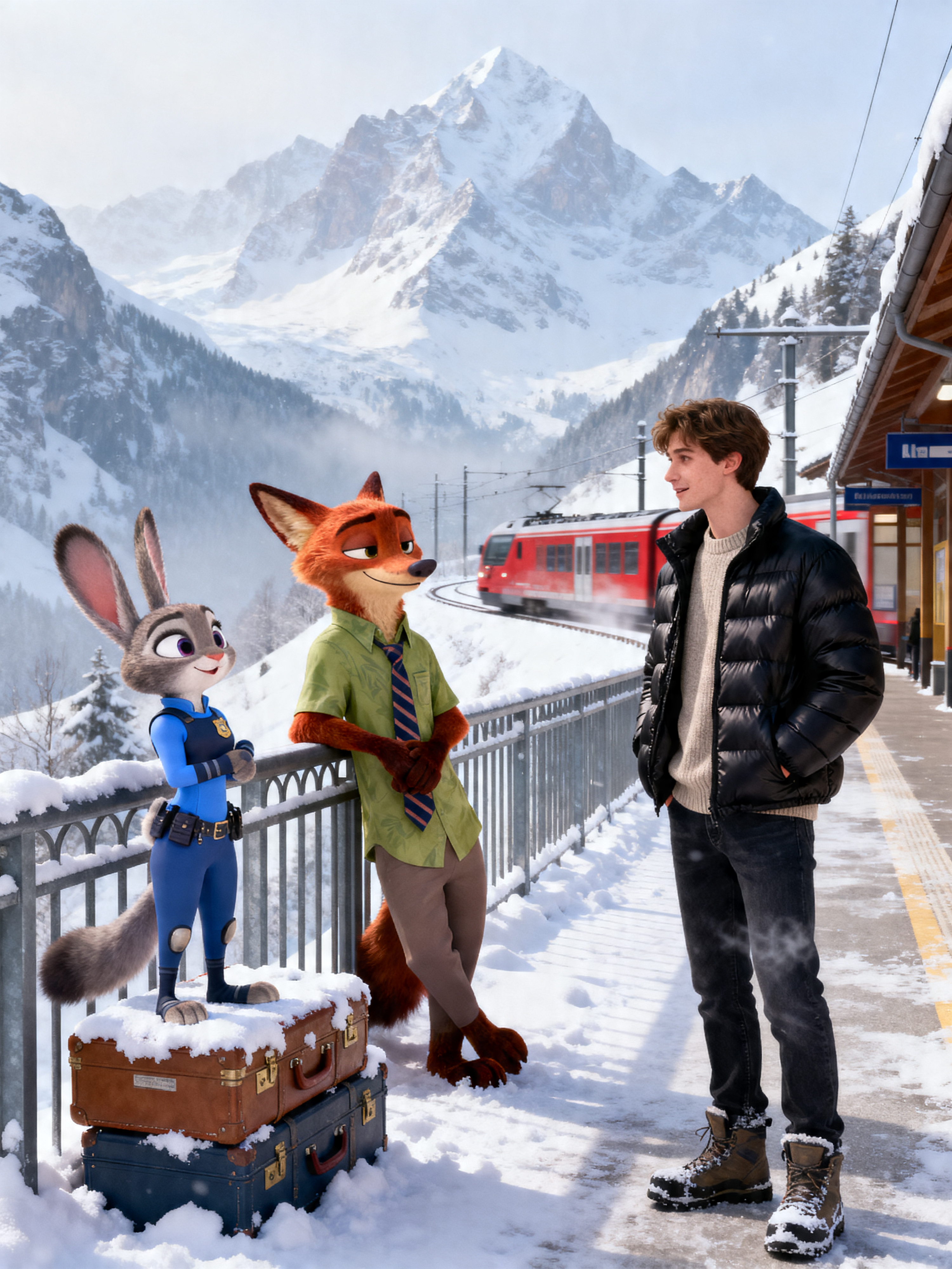 A cinematic winter travel moment set at a quiet Alpine mountain station just after snowfall. A young model stands near the edge of a snow-dusted platform, wearing a matte black puffer jacket over a neutral sweater, dark jeans, and winter boots. His posture is relaxed, hands in pockets, breath faintly in the cold air, with a calm, confident expression and natural, realistic skin texture. Beside him, Nick Wilde from Zootopia leans against a metal railing, hands casually folded, wearing his signature green shirt and striped tie, giving a knowing side-smirk as if mid-conversation. A few steps away, Judy Hopps stands atop a snow-covered luggage crate, adjusting her blue police uniform with an upbeat, alert expression, ears slightly raised. In the background, towering snow-covered Alpine peaks fade into soft atmospheric haze. A red mountain train slowly departs the station, leaving subtle motion blur and a sense of journey. Cold winter daylight, soft diffused light reflecting off the snow, realistic shadows grounded in the environment. Ultra-detailed textures, crisp winter air, cinematic depth of field. Photorealistic human seamlessly blended with high-quality animated characters. Travel-film aesthetic, emotionally warm yet minimal, high resolution, 4:5 aspect ratio.