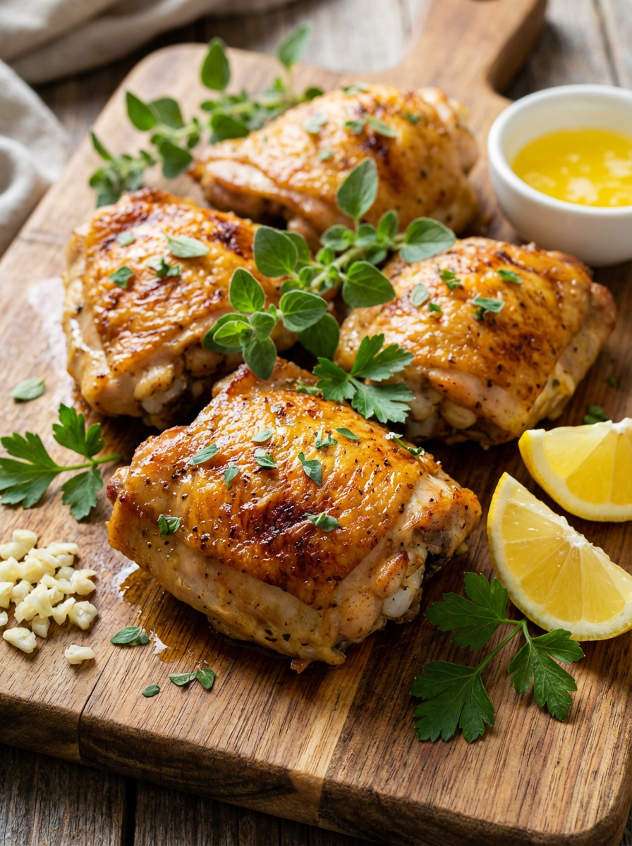 a close-up, ultra-realistic photograph perfect for a cookbook captures a beautifully baked herbed chicken with crispy golden skin, garnished with fresh oregano and parsley. The chicken thighs are arranged on a rustic wooden board with lemon wedges, minced garlic, and melted butter visible.