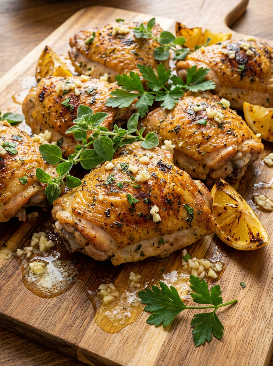 a close-up, ultra-realistic photograph perfect for a cookbook captures a beautifully baked herbed chicken with crispy golden skin, garnished with fresh oregano and parsley. The chicken thighs are arranged on a rustic wooden board with lemon wedges, minced garlic, and melted butter visible.