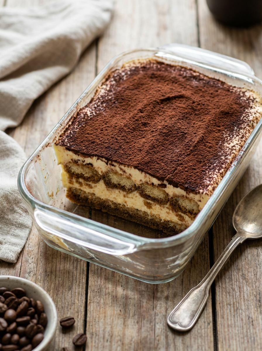 a close-up, ultra-realistic photograph perfect for a cookbook captures a classic tiramisu with distinct layers of coffee-soaked ladyfingers and mascarpone cream, dusted with cocoa powder and served in a glass dish.