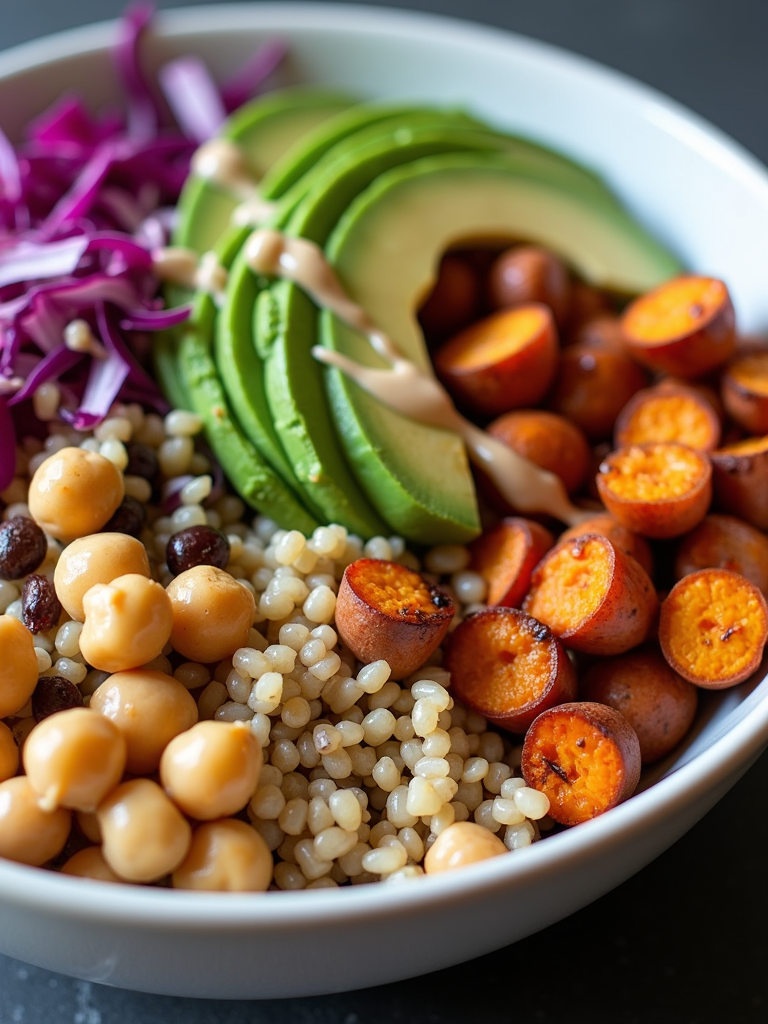 a close-up, ultra-realistic photograph perfect for a cookbook captures a colorful Buddha bowl with quinoa, roasted sweet potatoes, chickpeas, avocado slices, shredded red cabbage, and a tahini drizzle.