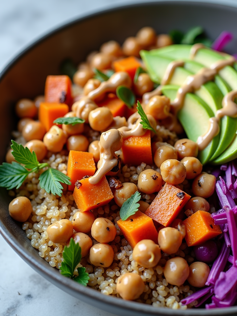 a close-up, ultra-realistic photograph perfect for a cookbook captures a colorful Buddha bowl with quinoa, roasted sweet potatoes, chickpeas, avocado slices, shredded red cabbage, and a tahini drizzle.