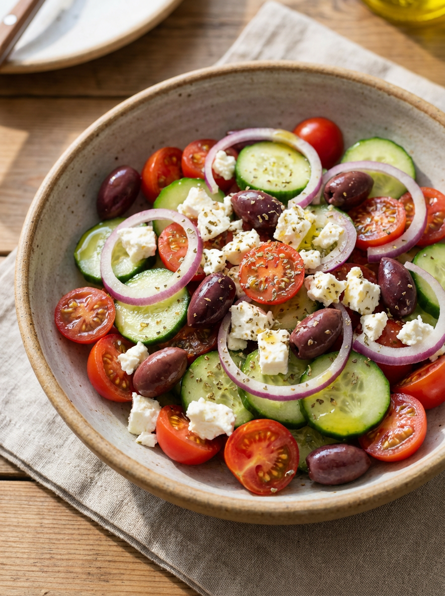 a close-up, ultra-realistic photograph perfect for a cookbook captures a colorful Mediterranean salad with cucumber, cherry tomatoes, red onion, kalamata olives, and feta cheese, drizzled with olive oil and sprinkled with oregano.