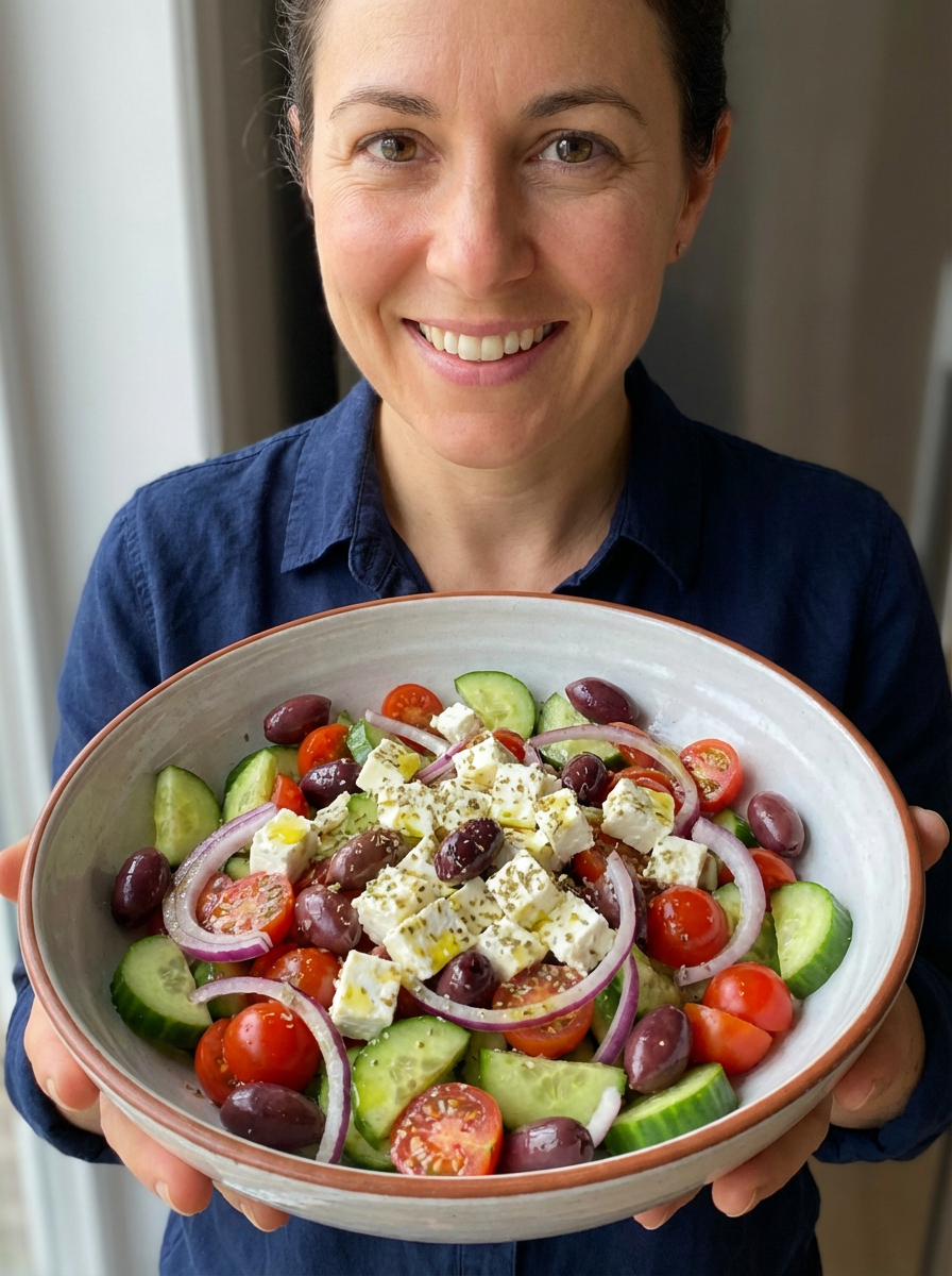 a close-up, ultra-realistic photograph perfect for a cookbook captures a colorful Mediterranean salad with cucumber, cherry tomatoes, red onion, kalamata olives, and feta cheese, drizzled with olive oil and sprinkled with oregano.
