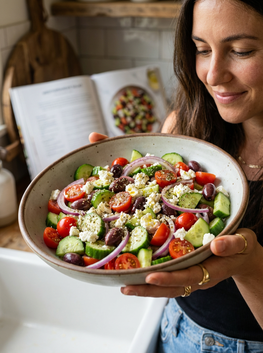 a close-up, ultra-realistic photograph perfect for a cookbook captures a colorful Mediterranean salad with cucumber, cherry tomatoes, red onion, kalamata olives, and feta cheese, drizzled with olive oil and sprinkled with oregano.