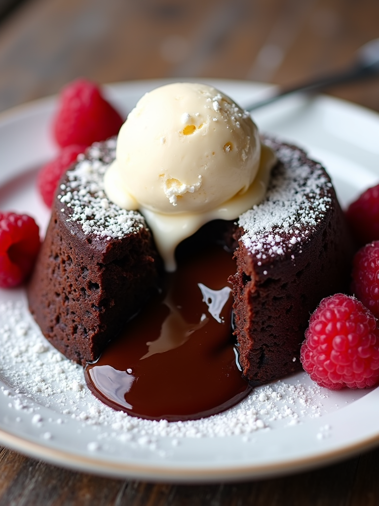 a close-up, ultra-realistic photograph perfect for a cookbook captures a decadent chocolate lava cake with molten center oozing onto a white plate, served with a scoop of vanilla ice cream and fresh raspberries, dusted with powdered sugar.