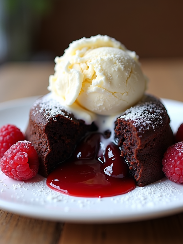 a close-up, ultra-realistic photograph perfect for a cookbook captures a decadent chocolate lava cake with molten center oozing onto a white plate, served with a scoop of vanilla ice cream and fresh raspberries, dusted with powdered sugar.