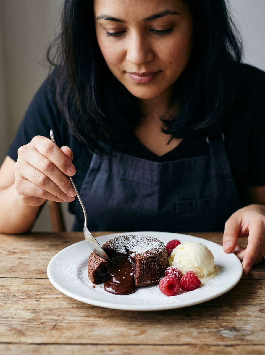 a close-up, ultra-realistic photograph perfect for a cookbook captures a decadent chocolate lava cake with molten center oozing onto a white plate, served with a scoop of vanilla ice cream and fresh raspberries, dusted with powdered sugar.