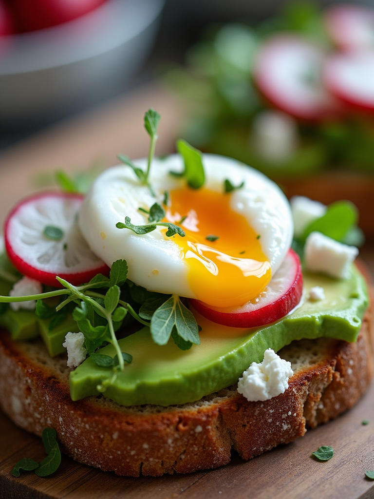 a close-up, ultra-realistic photograph perfect for a cookbook captures a fresh avocado toast on artisanal sourdough bread, topped with sliced radishes, microgreens, crumbled feta, and a perfectly poached egg with runny yolk.