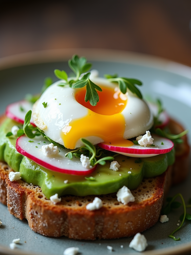 a close-up, ultra-realistic photograph perfect for a cookbook captures a fresh avocado toast on artisanal sourdough bread, topped with sliced radishes, microgreens, crumbled feta, and a perfectly poached egg with runny yolk.