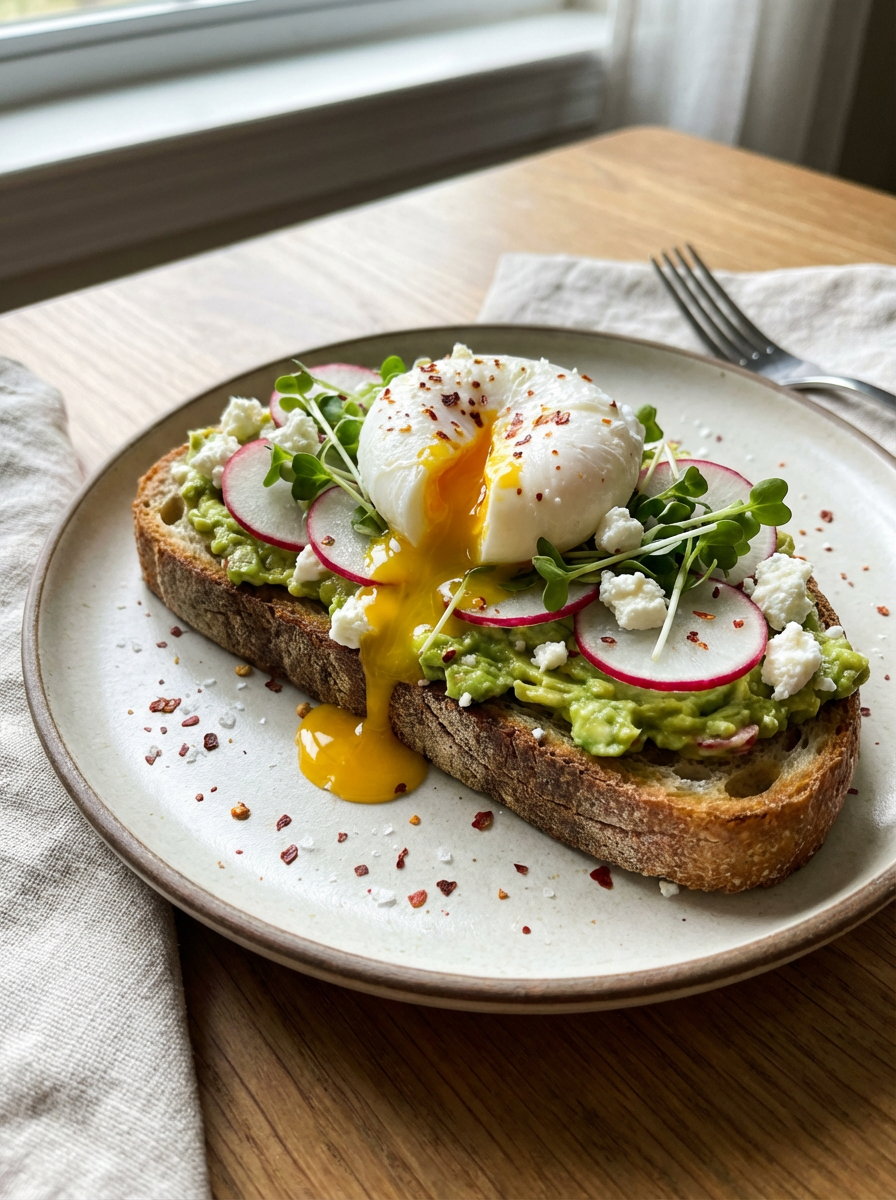 a close-up, ultra-realistic photograph perfect for a cookbook captures a fresh avocado toast on artisanal sourdough bread, topped with sliced radishes, microgreens, crumbled feta, and a perfectly poached egg with runny yolk.