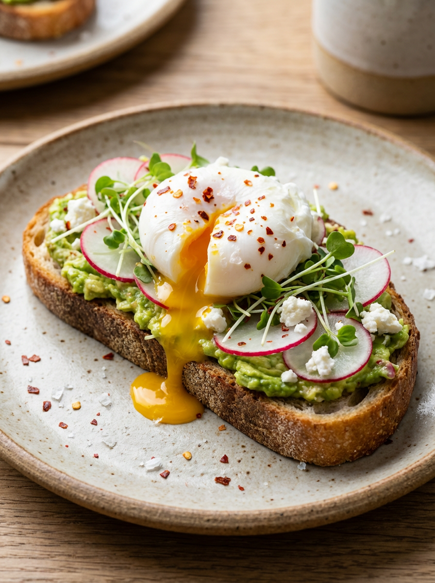 a close-up, ultra-realistic photograph perfect for a cookbook captures a fresh avocado toast on artisanal sourdough bread, topped with sliced radishes, microgreens, crumbled feta, and a perfectly poached egg with runny yolk.