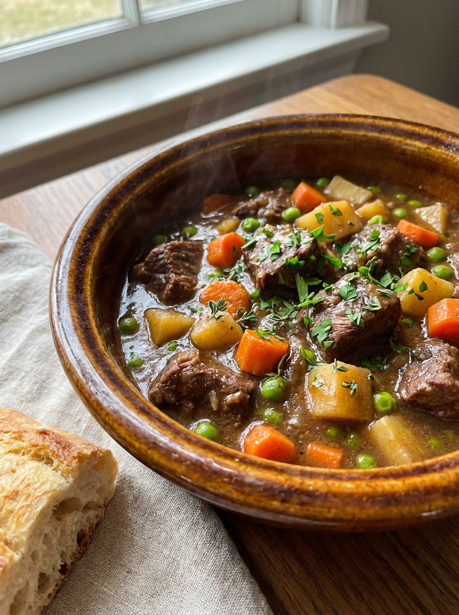 a close-up, ultra-realistic photograph perfect for a cookbook captures a hearty beef stew with tender chunks of meat, carrots, potatoes, and peas in a rich gravy, served in a rustic ceramic bowl with fresh herbs.